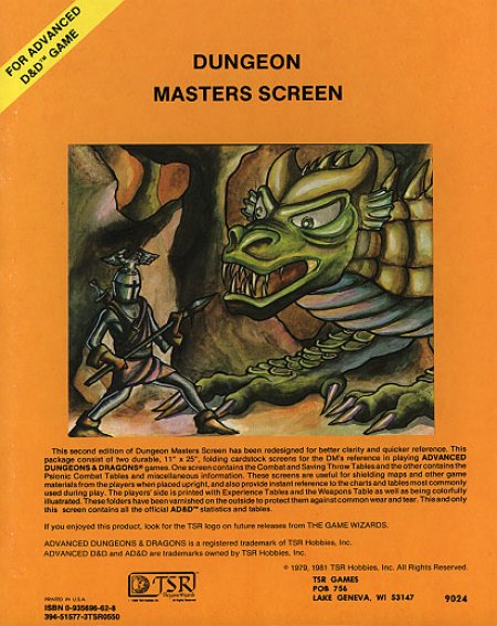 This package consists of two durable and folding cardstock screens for the DM′s reference use in playing ADVANCED DUNGEONS & DRAGONS: an 11″ × 34″ folder of the COMBAT AND SAVING THROW TABLES, and an 11″ × 17″ folder of the PSIONIC COMBAT TABLES. These screens are useful for shielding maps and other game materials from the players when place upright, and also provide instant reference to the most commonly used charts and tables during play. The player's side is colorfully illustrated to help set the mood, as well as printed with tables for the more standard character classes and the WEAPONS TABLE. These folders have been laminated on both sides to protect them against common wear and tear. This (and only this) screen contains all the official AD&D statistics and tables.
