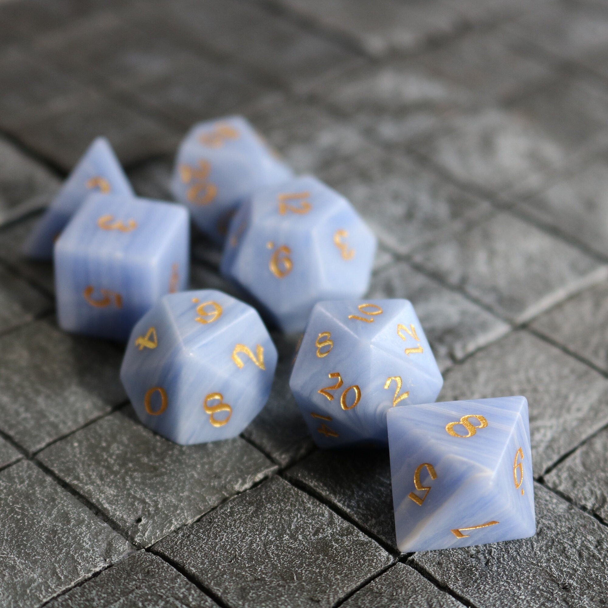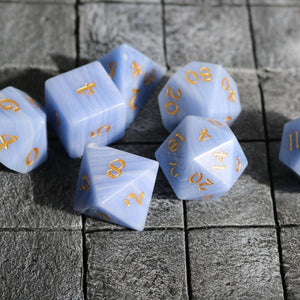 Enrapture your senses with the Hand Carved Gemstone Blue Lace Agate Eye Stone Dice Set. Each die in this exquisite collection is meticulously hand-crafted from genuine blue lace agate, showcasing the stone's captivating bands of blue and white. The mesmerizing "eye" pattern on each die evokes a sense of mystery and intrigue, perfect for enhancing your tabletop adventures.