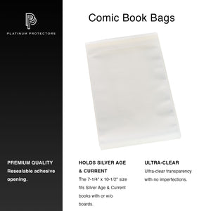 Platinum Protectors new version Silver Age bags now include the adhesive strip on the back of the main sleeve instead of the flap. This helps prevent and adhesive getting on your comic from the flap. Our resealable comic book bags are for the serious comic collector. Stop wasting your time using a piece of tape on every bag. With the resealable adhesive on the back of the bag, it's the perfect way to keep your books clean and scratch free. Ultra-clear transparency with no imperfections. Can be used with or without boards. Resealable adhesive opening allows for easy insertion/removal of your books.