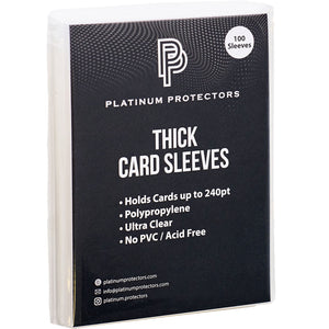 Platinum Protectors premium quality soft sleeves are for the serious card collector. The perfect way to keep your thicker trading cards safe and secure. Ultra-clear transparency with no imperfections. Great way to add more protection to your cards when using a toploader or pocket pages. Fits all standard size 3" x 4" cards up to 240pt.