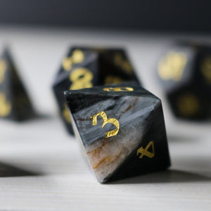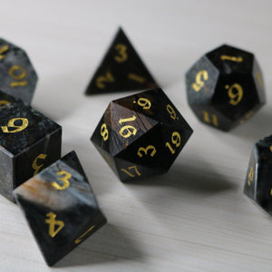 Unleash your inner magic with this mesmerizing set of black gemstone dice! Each die is meticulously hand-carved, featuring the piercing gaze of an eagle's eye. Feel the power of the night as you roll these exquisite dice, perfect for any tabletop adventure.