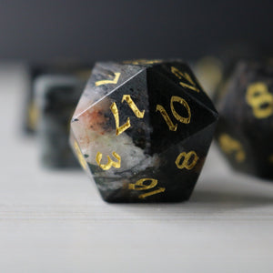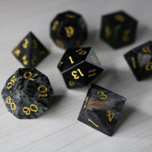 Important Note:Gemstone dice are delicate and can chip if dropped on hard surfaces. Roll with care on a soft surface like a dice tray or playmat.