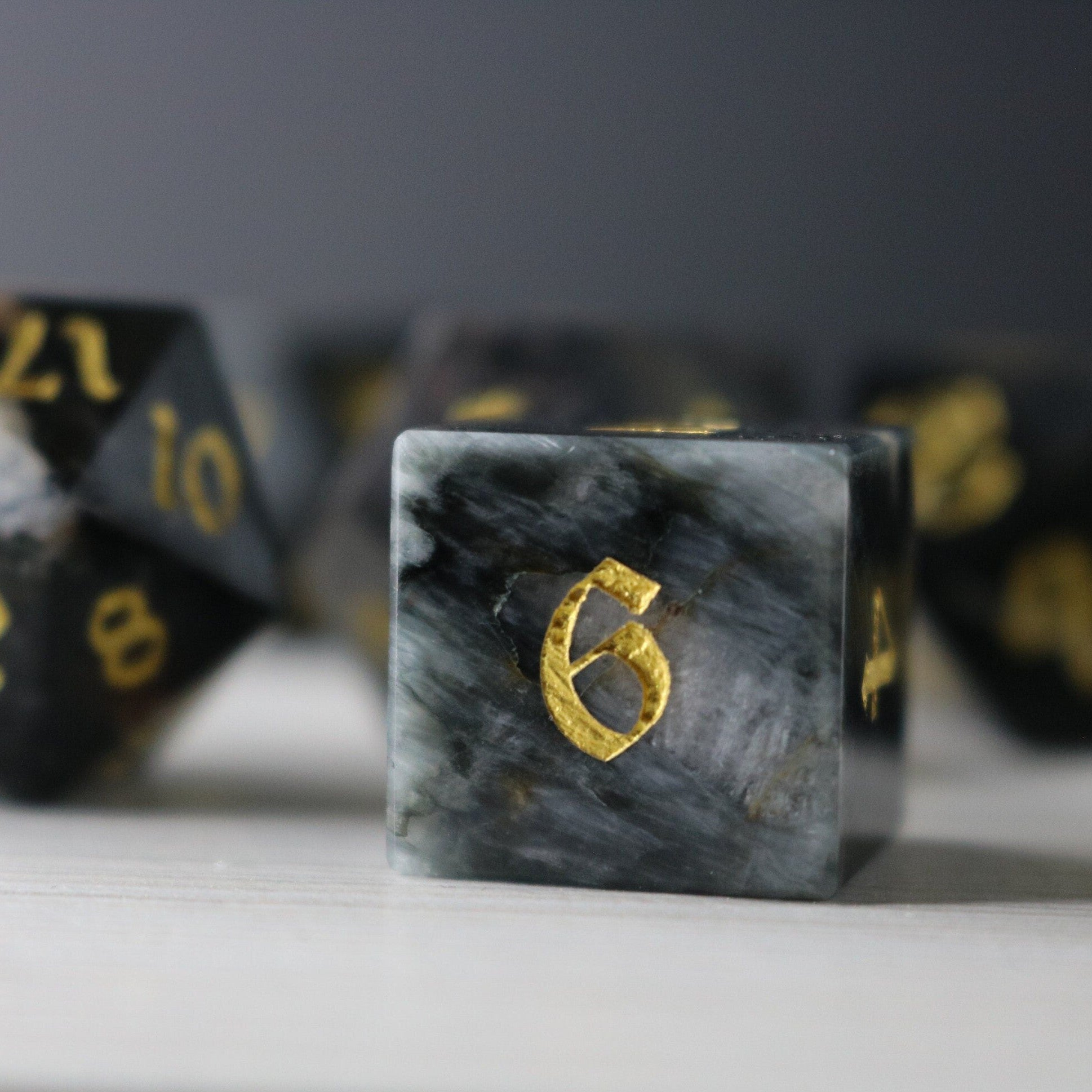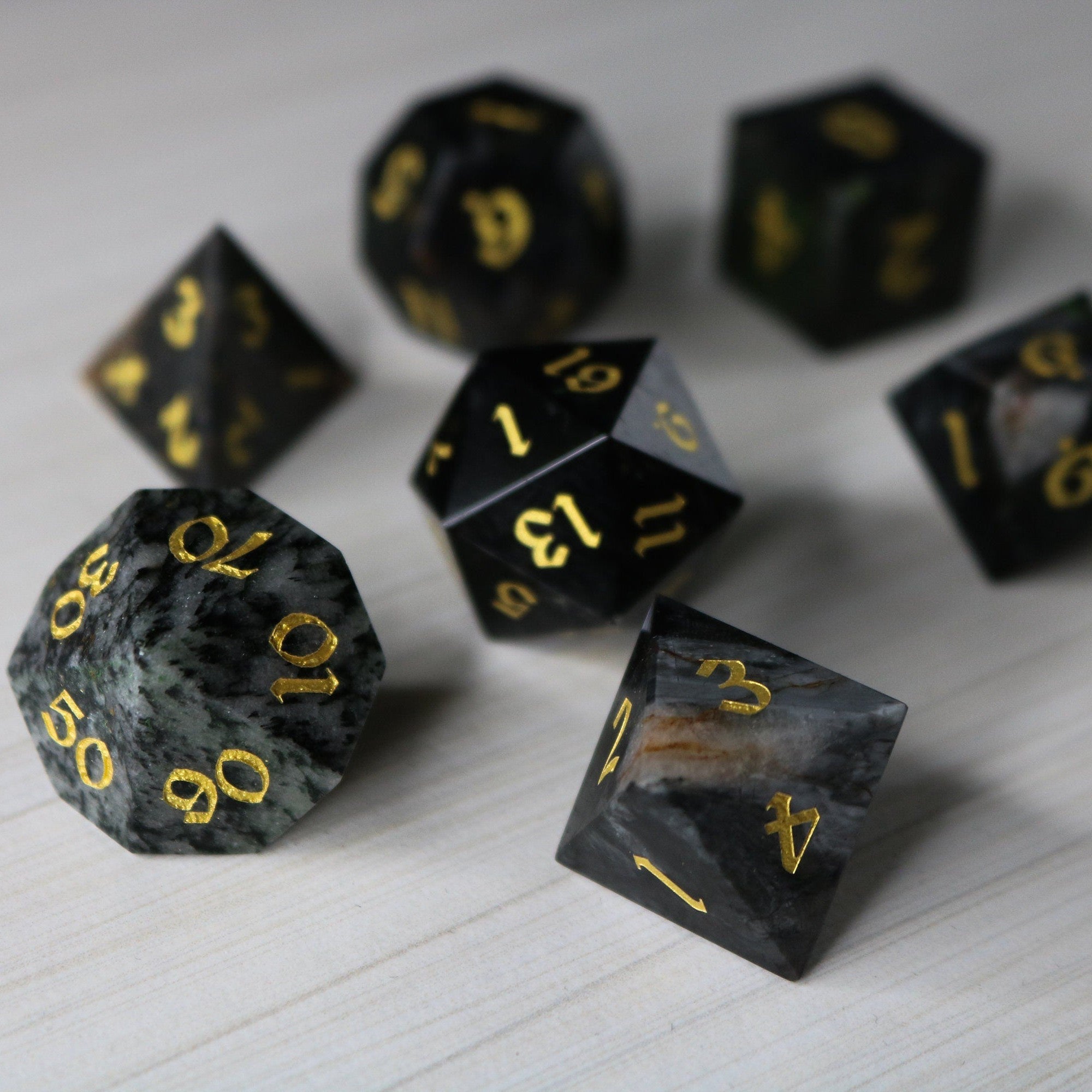 ✅ 7 Hand-Carved Gemstone Dice (d4, d6, d8, d10, d%, d12, d20)