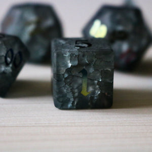 Channel the raw power of a thunderstorm with this electrifying dice set! Each die is crafted from cracked glass, filled with black ink that dances like lightning within. These unique dice are sure to spark excitement at your next tabletop game.