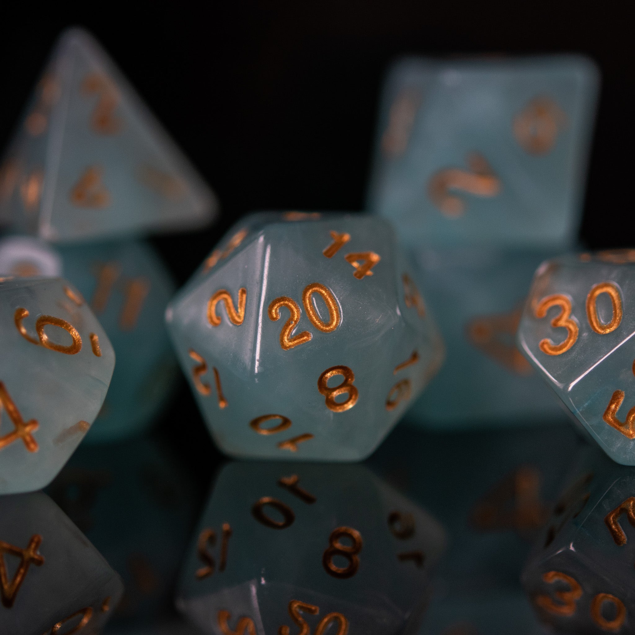 Our acrylic dice are carefully poured into individual molds and cured inside a vacuum chamber to insure no air bubbles are trapped inside the dice. After curing, each individual die is removed from the mold and numbers are painted by hand. These dice are perfect for any RPG and will sure to impress at your upcoming session!