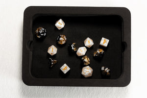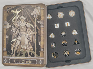 Realize your full potential as a Cleric with these leveled-up dice sets from Beadle & Grimm’s. Each set contains beautiful resin dice specific to your role, and those dice will roll beautifully in the large, EVA-lined tins that double as rolling trays! Unseal this relic to reveal 14 dice in two distinct styles: four d8s for healing allies or dispatching enemies with your god’s sacred flame.