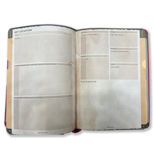 This A5-sized (5.8" x 8.3") journal is almost 200 pages for you to keep your plans, record your notes, and manage your adventure. There are sections for tracking magic items, roleplaying bonuses, great moments, embarrassing defeats,