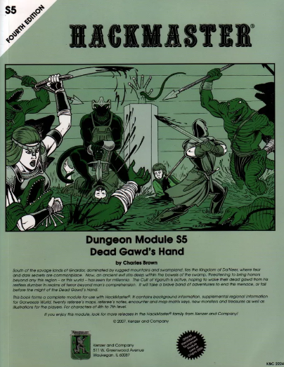 South of the savage lands of Gnardor, dominated by rugged mountains and swampland, lies the Kingdom of Da'Neer, where fear and dark secrets are commonplace. Now, an ancient evil stirs deep within the bowels of the swamp, threatening to bring horrors beyond any this region "“ or this wurld "“ has seen for millennia. The Cult of Ygaruth is active, hoping to wake their dead gawd from his restless slumber in realms of terror beyond man's comprehension. Now, it will take a brave band of adventurers to end this menace, or fall before the might of the Dead Gawd's Hand. This combination town, wilderness and dungeon adventure is intended for 4th to 7th level characters. 128 pages, b&w