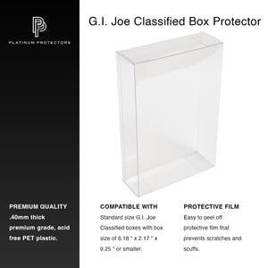 Platinum Protectors plastic protector cases are designed to fit your GI Joe Classified boxes perfectly. You have money invested in your collection, so why not show them off? Display your boxes with our highest quality, acid-free PET plastic material that will shield your boxes from everyday wear and tear.