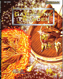 The Lunar Empire has been defeated at the Battle of Iceland. Orlanth is free, and across Dragon Pass and the world the winds have been released. This is the time to strike, the time for heroes to raise the rest of the land against the Empire, begin quests that will take years to bear fruit, and finally to aid Kallyr as she returns a lost planet to the sky and upsets the plans of the Empire. Gathering Thunder is the third book of the Sartar Rising campaign. It continues the epic struggle of the Heortlings against the Lunar Empire, building on the events and information provided in Barbarian Adventures and Orlanth is Dead!, the first two books of the series. This 80-page book includes six scenarios set in Dragon Pass, each a testing ground for heroes as they rise to become leaders in the rebellion: *The New Breathers, by Martin Hawley *Sheep, Clouds, Thunder, by Jeff Kyer *The Other Side of the Dragon, by David Dunham *Kill Wasps! by Ian Cooper *Final Days at Skullpoint, by Ron Edwards *Ship of the Sky, a heroquest by Greg Stafford Dragon Trove ID 3295
