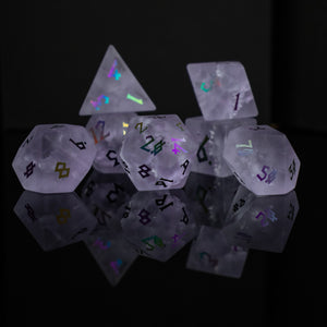 Each die is hand-carved from glass and polished in a proper tumbler. Designs are then engraved into each side and hand-painted. Shattered glass dice are never guaranteed to have a perfectly balanced weight; however, each of our dice sets are always well-weighted and well-balanced.