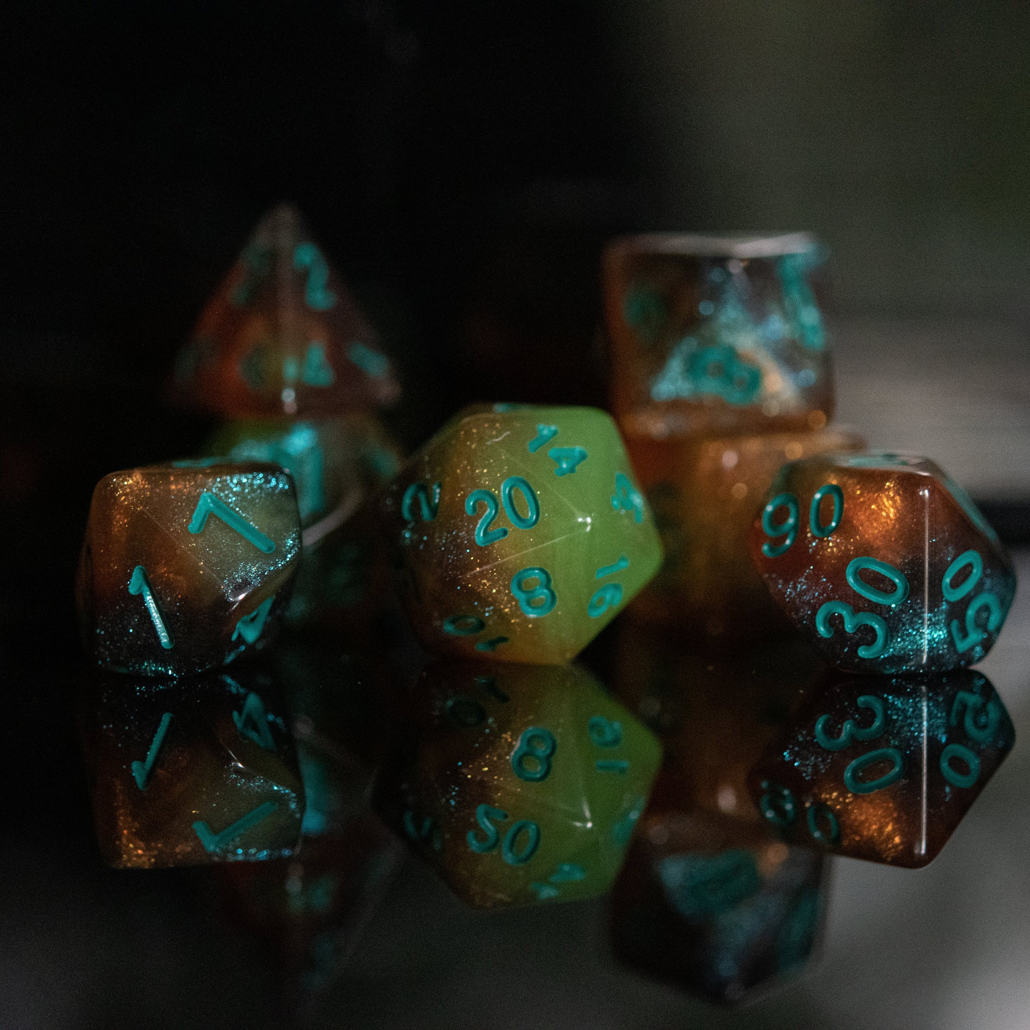 Our acrylic dice are carefully poured into individual molds and cured inside a vacuum chamber to insure no air bubbles are trapped inside the dice. After curing, each individual die is removed from the mold and numbers are painted by hand. These dice are perfect for any RPG and will sure to impress at your upcoming session!