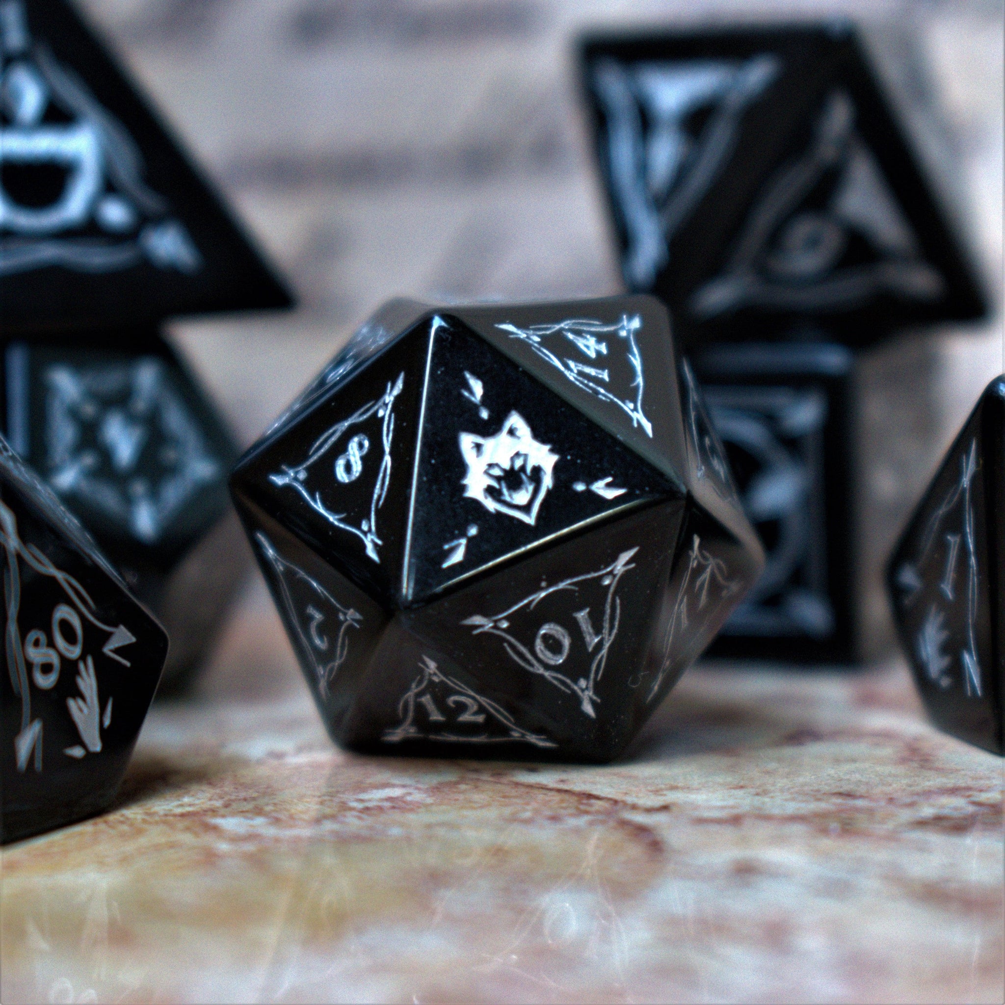 Each die is hand carved from pure gemstone and polished in a proper tumbler. Designs are then engraved into each side and hand painted. Gemstone dice are never guaranteed to have a perfectly balanced weight; however, each of our dice sets are always well weighted and well balanced.