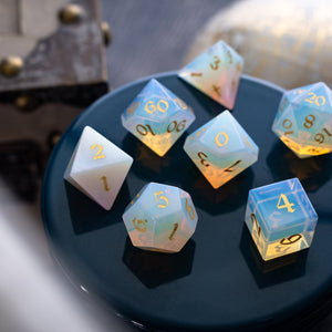 Roll in style with these stunning opalite dice! Each die is meticulously hand-carved from genuine opalite and features shimmering gold numbers for easy reading. Whether you're a seasoned adventurer or a new player, these iridescent dice will bring a touch of magic to your tabletop game nights.