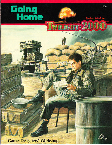 Going Home is an adventure for use with GDW's post-World War III role-playing game Twilight: 2000, In Going Home, the players are presented with the challenge of getting across most of Poland and north-central Germany to catch the last ship heading back to the US for quite a while. Even if the players choose to remain in Europe, Going Home will still be of tremendous interest. The adventure contains:A full-color pull-out map, covering northern Germany which overlaps with the full-color Poland map included in the original game.A referee's update of the location and strength of NATO and Warsaw Pact units in their winter quarters as the year 2000 draws to a close.A brief rundown of French units in the occupied area west of the Rhine and a discussion of French military activities in the so-called "dead zone" east of the Rhine. Also, a bonus: descriptions (in Twilight: 2000 terms) of three French helicopters.Details and specifications, in Twilight: 2000 terms, of the German Leopard III and the British Challenger tanks, and British 120mm rifled gun".