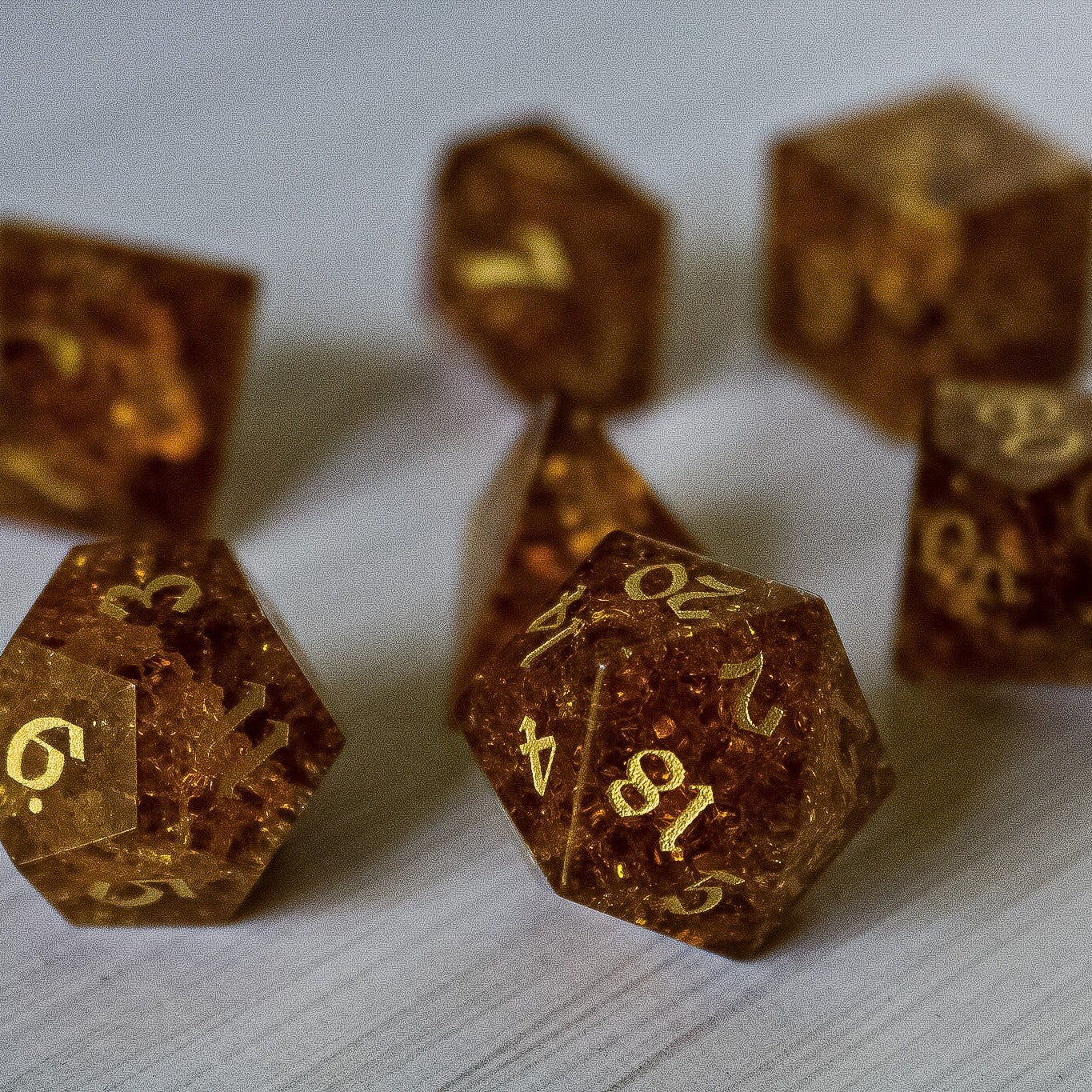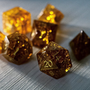 Unleash the power of a thunderstorm with this electrifying set of dice! Crafted from shimmering gold and honey-colored glass, each die is infused with the raw energy of lightning, crackling with excitement and anticipation. Perfect for channeling your inner storm sorcerer or electrifying your next tabletop adventure.
