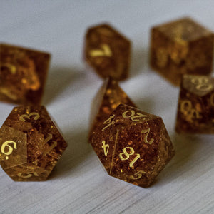 Important Note:Gemstone dice are delicate and can chip if dropped on hard surfaces. Roll with care on a soft surface like a dice tray or playmat.