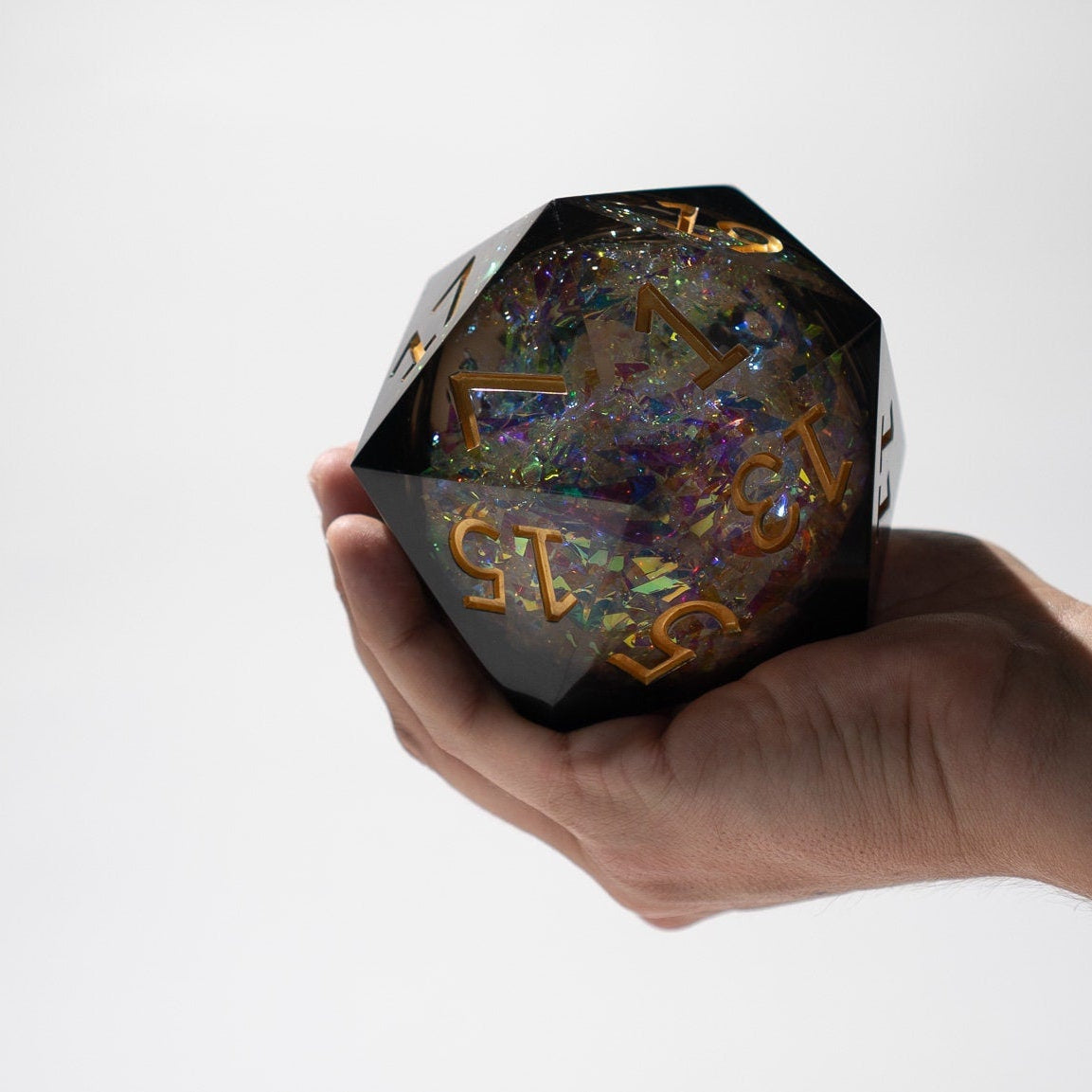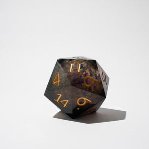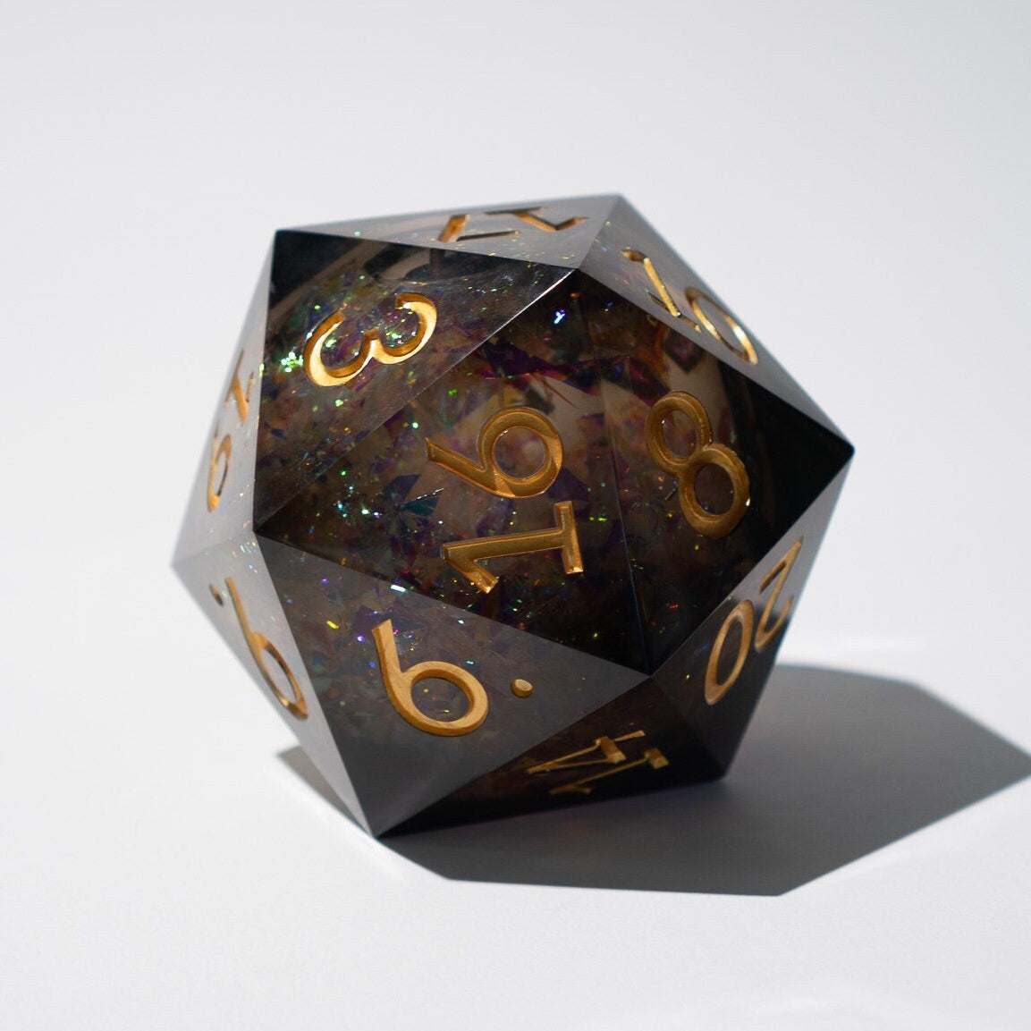 Enthral your senses with this captivating set of jumbo-sized resin dice, each infused with a mesmerizing black liquid core and shimmering foil accents. Perfect for those drawn to the mystique of the night, these dice are not merely tools for play, but gateways to realms of shadowy allure and arcane power.