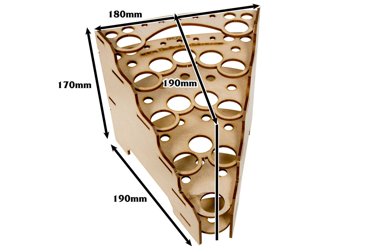 Your miniatures may be works of art, but a disorganized desk certainly isn't. Get your paints and brushes in line with our Modular Paint Rack system! These MDF racks hold your paint pots, bottles and brushes in a tiered layout for easy organization and access when customizing your game pieces. Multiple racks can be combined into a larger system using the included clips!
