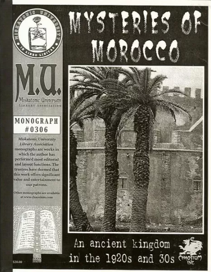 A Miskatonic University Library Association (MULA) monograph on using Morocco as a setting in Call of Cthulhu. This includes descriptions on Morocco, its culture and a scenario.