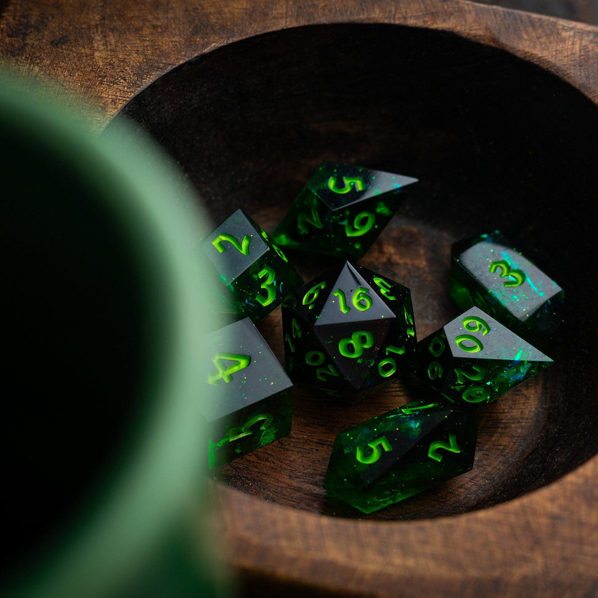 Unleash the magic of the night with this captivating set of Nox Green resin dice. Each die is meticulously handcrafted, showcasing a unique blend of swirling greens and deep blacks, reminiscent of a moonlit forest. Perfect for your next tabletop adventure, these dice add an enchanting touch to your game.