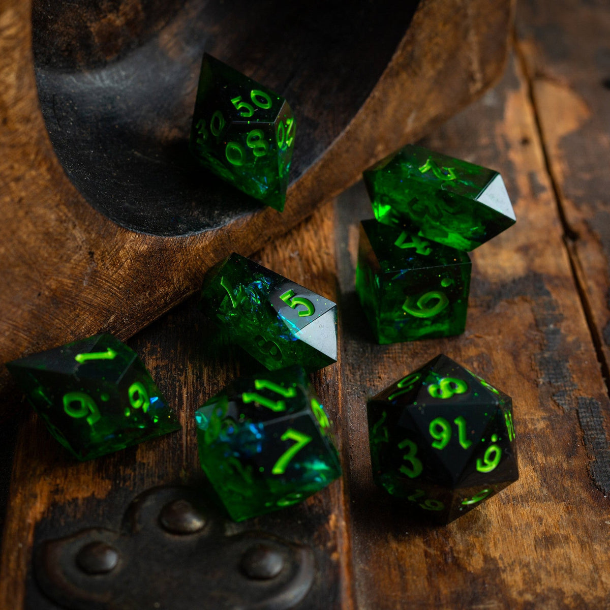 ✅ 7 Hand-Carved Resin Dice (d4, d6, d8, d10, d%, d12, d20)