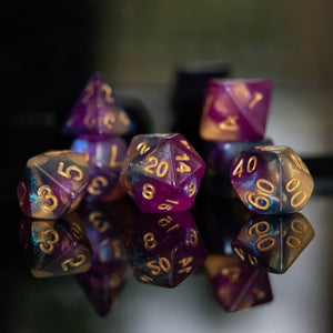 Our acrylic dice are carefully poured into individual molds and cured inside a vacuum chamber to insure no air bubbles are trapped inside the dice. After curing, each individual die is removed from the mold and numbers are painted by hand. These dice are perfect for any RPG and will sure to impress at your upcoming session!