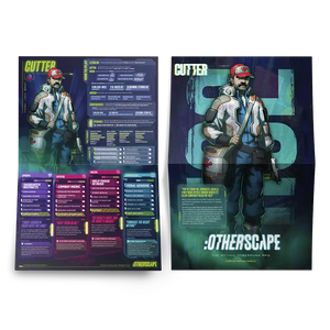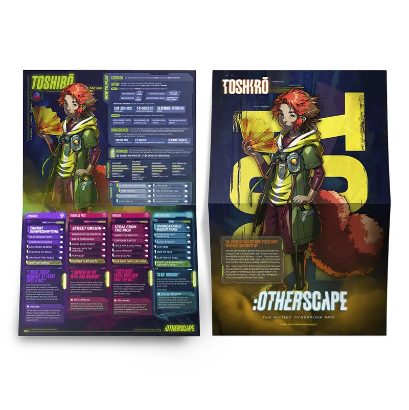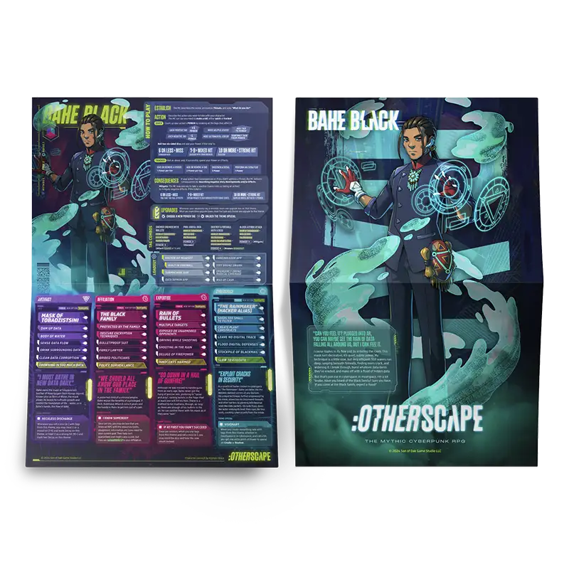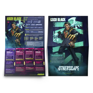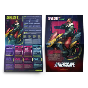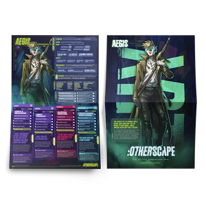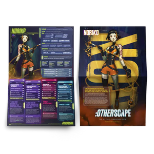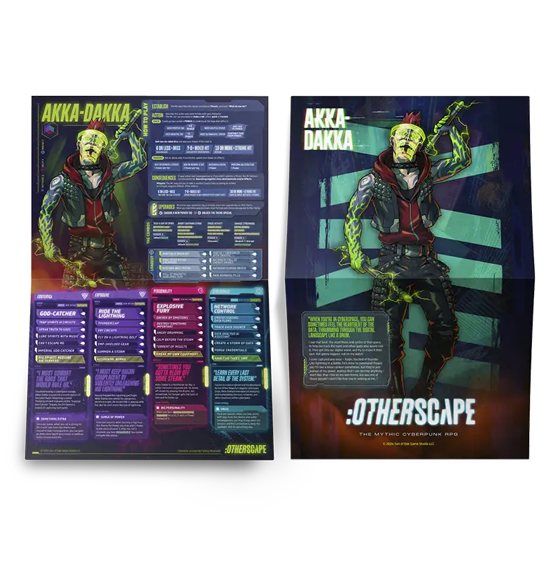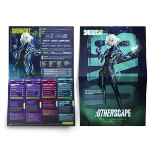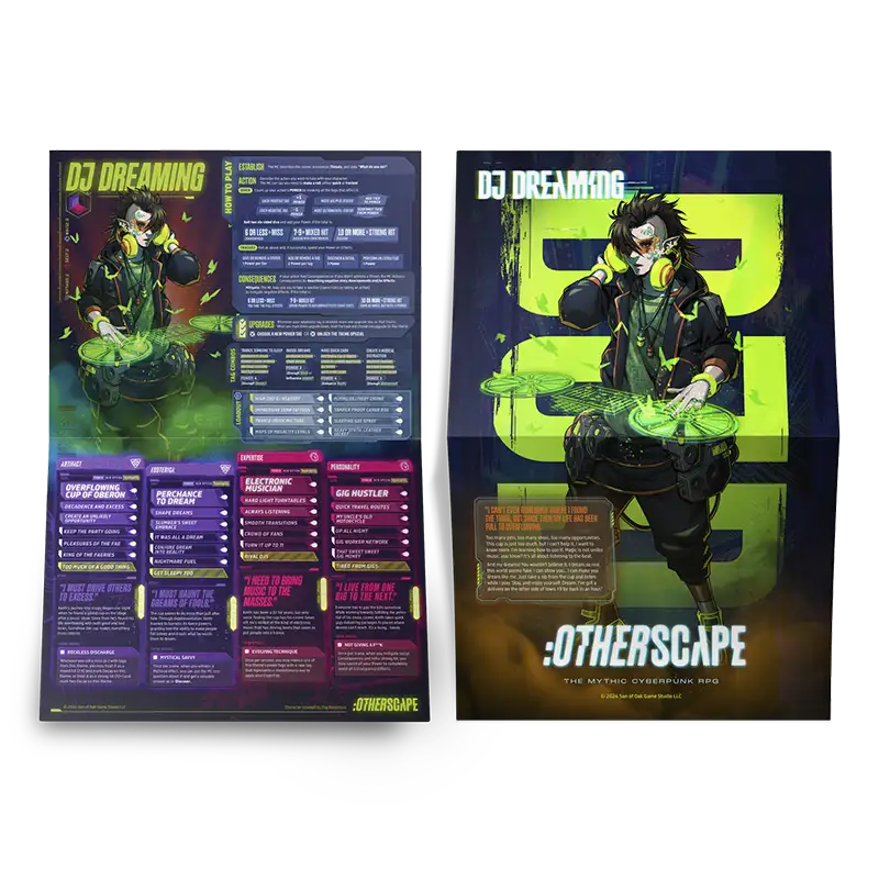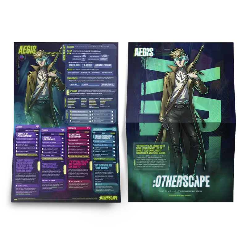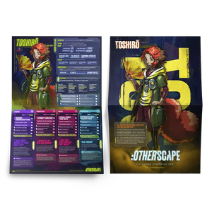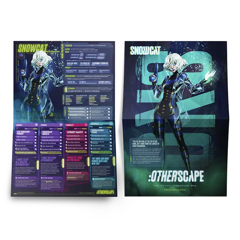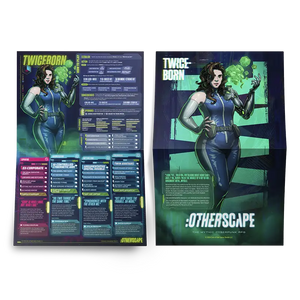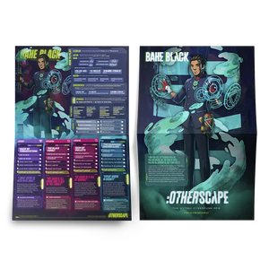 The :Otherscape Character Pack 2 contains 15 two-sided and foldable US-letter sized character folios that can also double as posters, a graphic summary of the game rules and dice roll outcomes, and suggestions for cool tag combos.