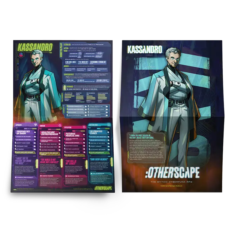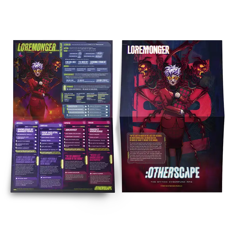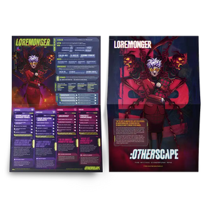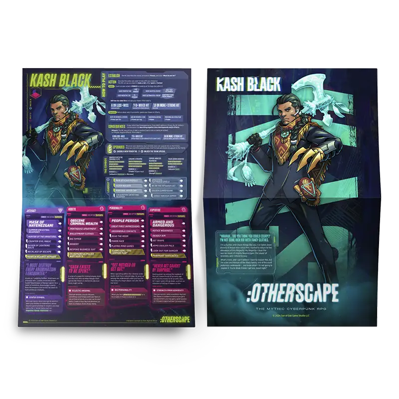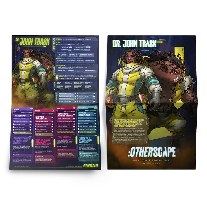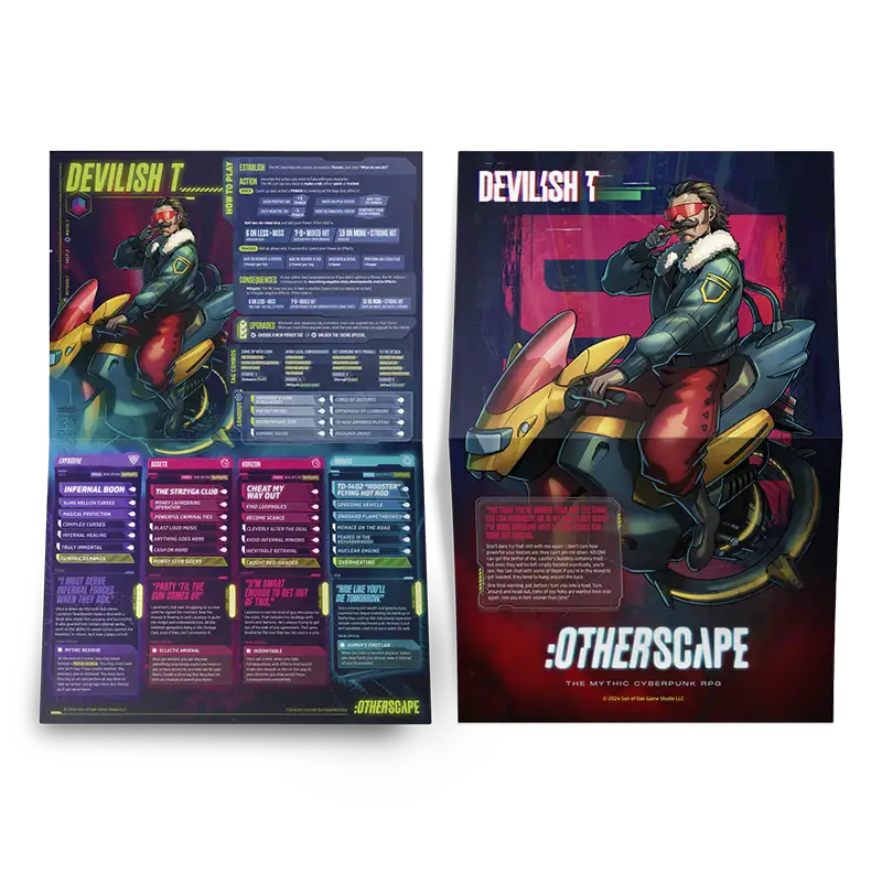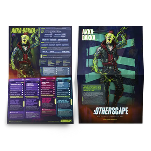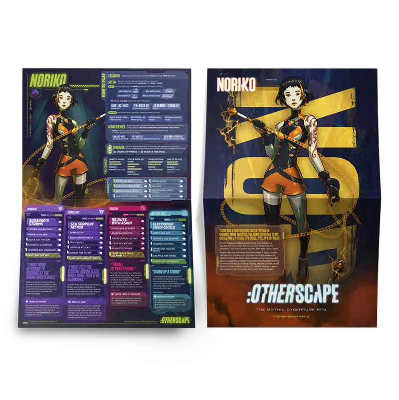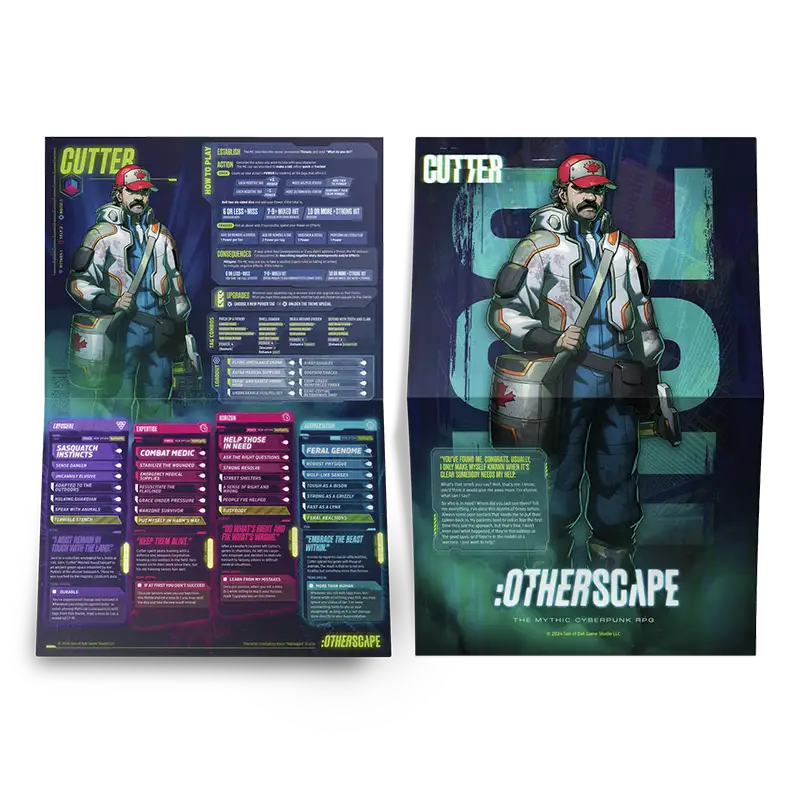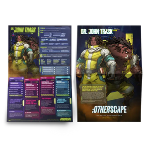 The :Otherscape Character Pack 2 contains 15 two-sided and foldable US-letter sized character folios that can also double as posters, a graphic summary of the game rules and dice roll outcomes, and suggestions for cool tag combos.