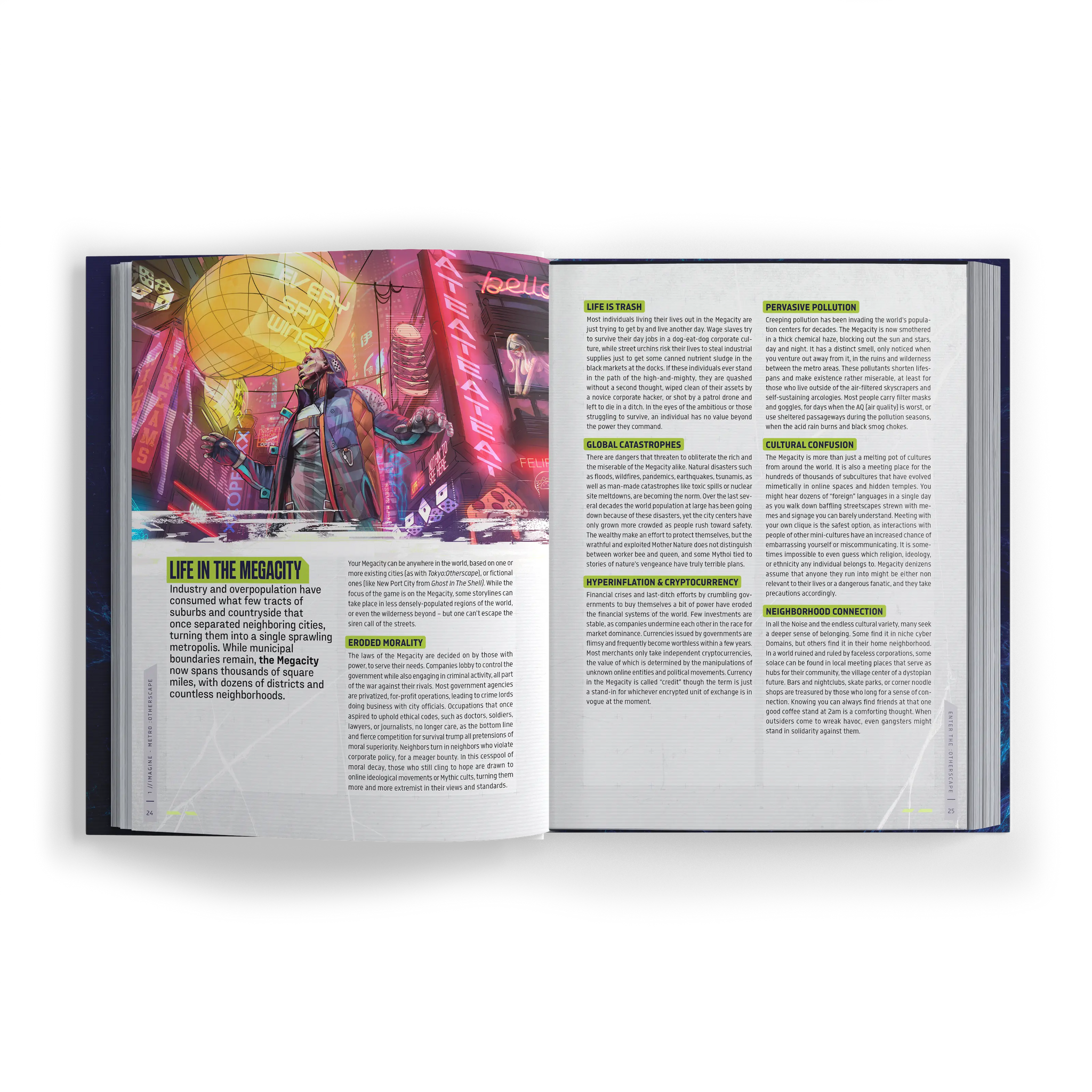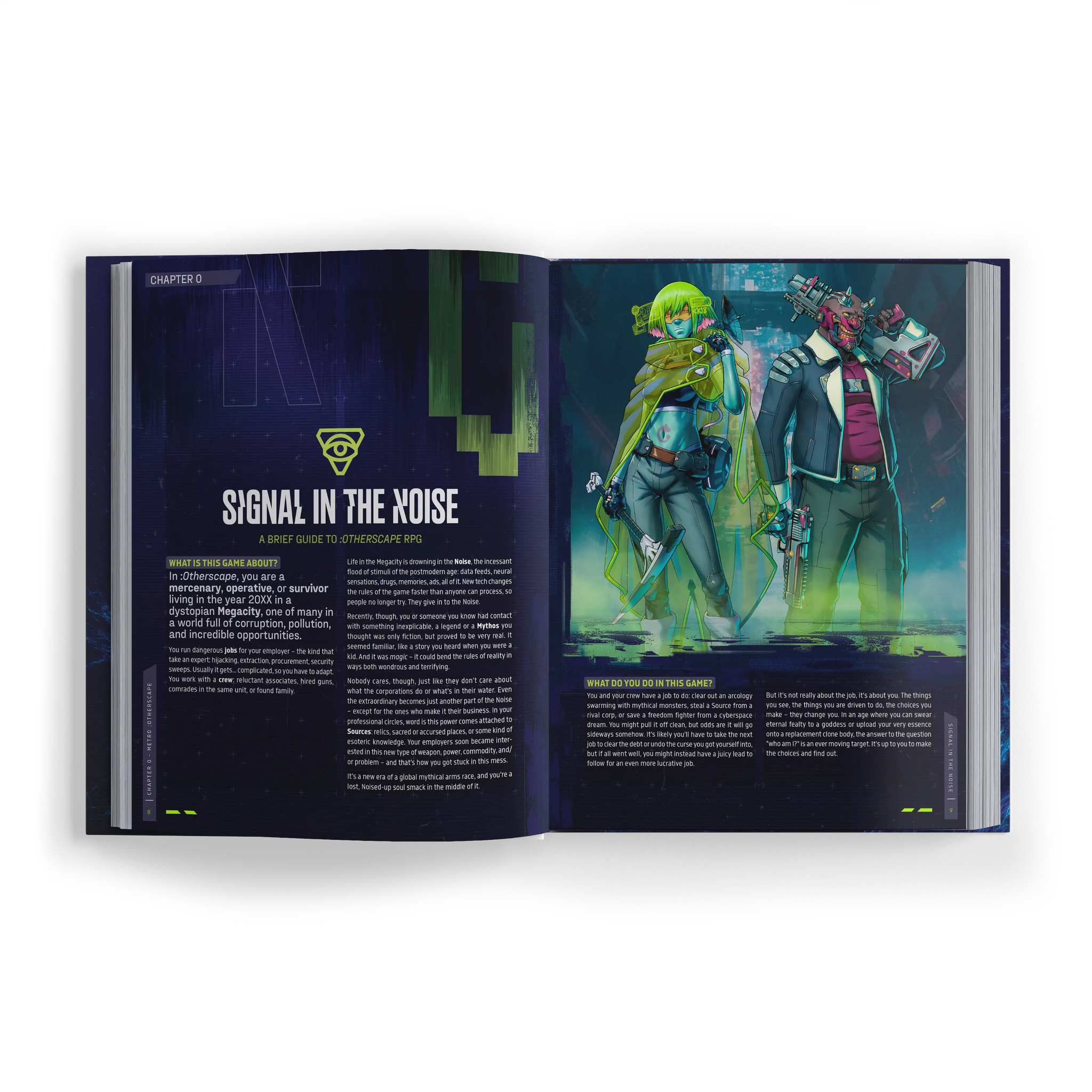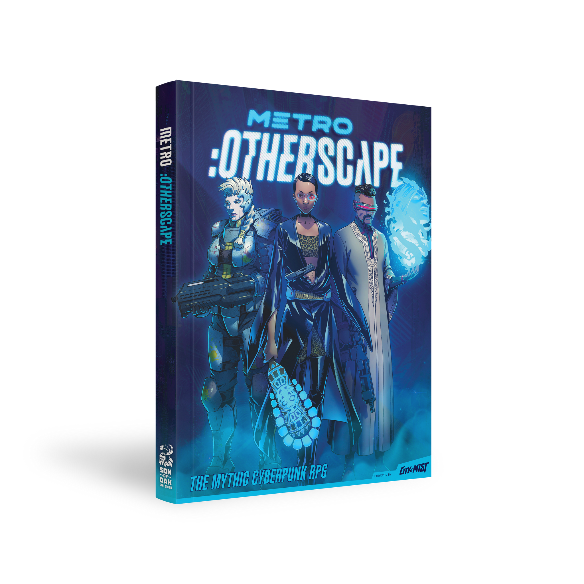 :Otherscape is a fantasy-cyberpunk role-playing game that combines supernatural powers inspired by mythology and legend with the gritty neon-lit streets of a sprawling futuristic Megacity. It takes your game group on a rollercoaster ride of gunfights, vehicle chases, cyberspace heists, urban wasteland exploration, clashes of mythology and technology, faction wars, and philosophical questions about the nature of being human — and how to transcend it.