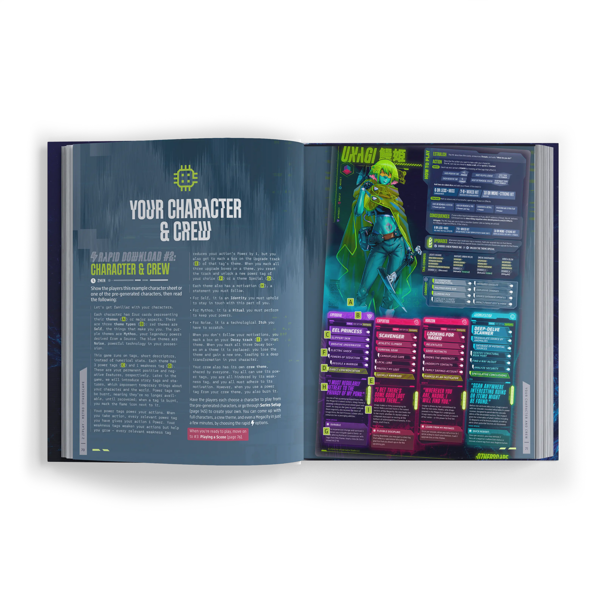 Metro:Otherscape is the complete :Otherscape corebook with everything you need to learn and play the game: setting, rules, rapid and custom character creation and evolution, guides for the Master of Ceremonies, and plenty of ready-to-use content, including a full “learn-as-you-play” starter job (adventure).