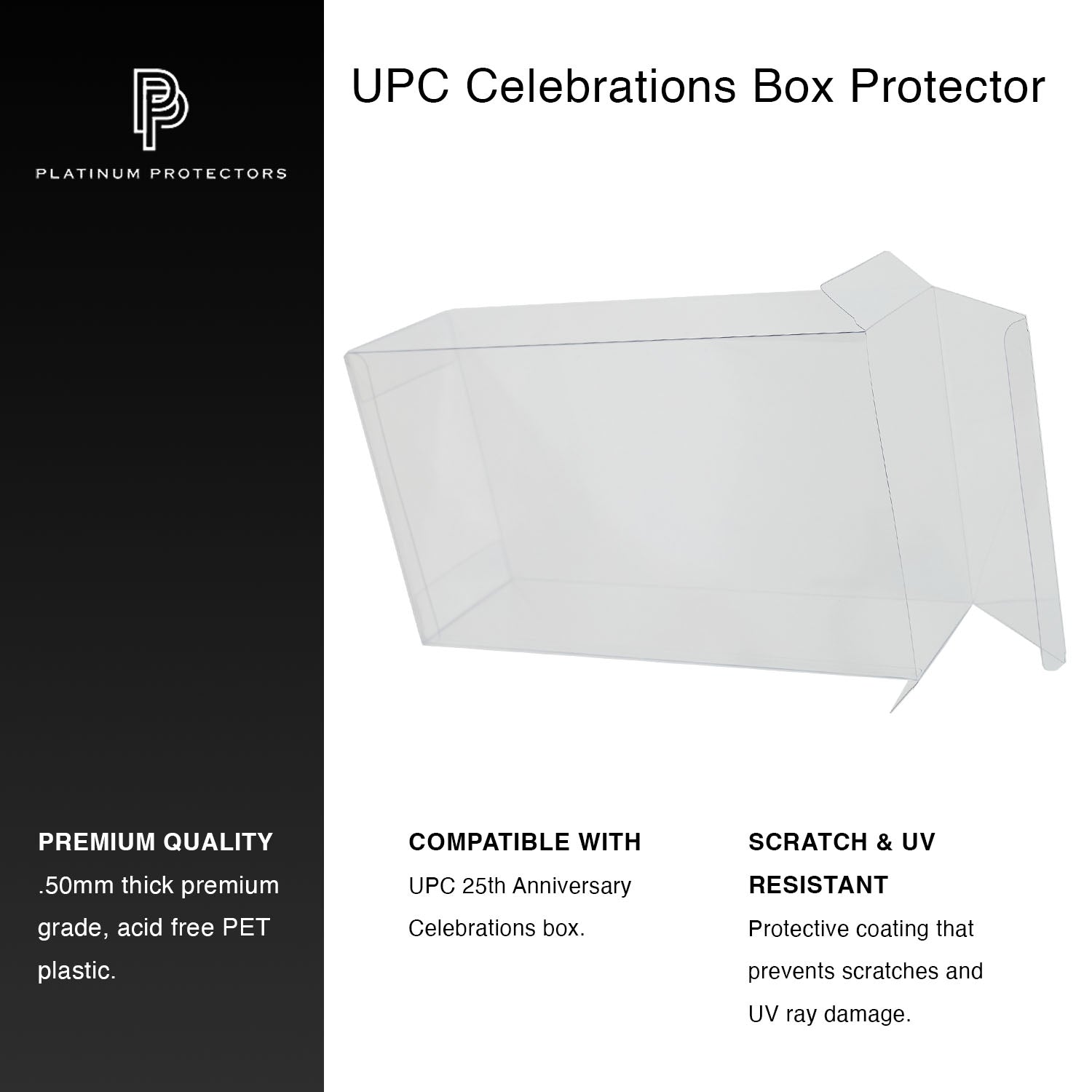 Platinum Protectors unveils its redesigned protectors for Pokemon Ultra Premium 25th Anniversary Celebrations boxes. Now UV and scratch-resistant, these protectors keep your TCG boxes pristine, preventing fading and damage. Crafted from ultra-clear, acid-free PET plastic, our open-end design ensures effortless insertion, superior durability, and a premium display.