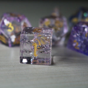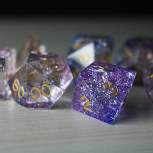 Embrace the ethereal beauty and fiery spirit of the Purple Cloud Forge Fire Glass Dice Set. Each die in this mesmerizing collection is hand-crafted from vibrant purple glass, swirling with wisps of cloudy white and fiery orange hues.