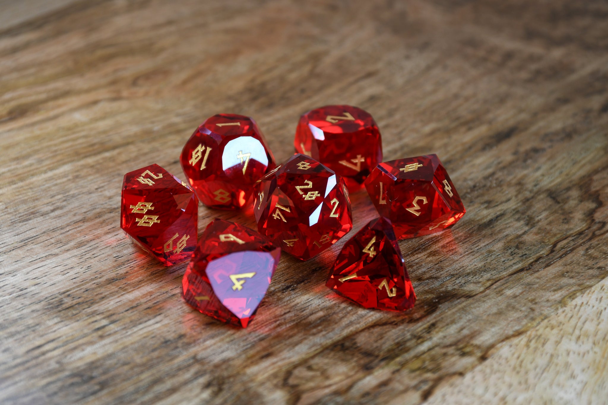 Each die is hand cut from zircon prism glass, sanded, and polished. Designs are then engraved into each side and hand painted. Glass dice are known to have a well balanced weight due to the lack of air bubbles inside the glass. These glass are multifaceted cut to give more refraction and shine!