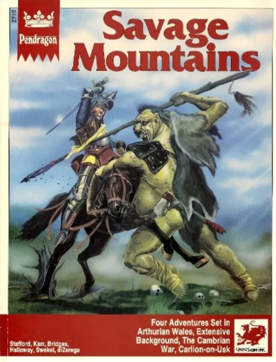 Savage Mountains features four complete adventures for the King Arthur Pendragon roleplaying game, set among the wild mountains of Wales. Ample background information is provided for the gamemaster. including details on the peoples of the region, politics, and notable places. Particular sections of this book are intended to be photocopied and be given to the players. A major city in the region, Carlion-on-Usk, is described and is illustrated in detail.