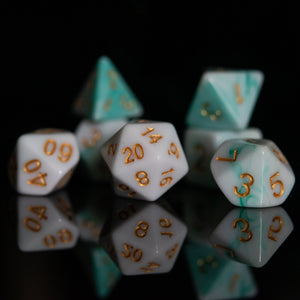 Our acrylic dice are carefully poured into individual molds and cured inside a vacuum chamber to insure no air bubbles are trapped inside the dice. After curing, each individual die is removed from the mold and numbers are painted by hand. These dice are perfect for any RPG and will sure to impress at your upcoming session!