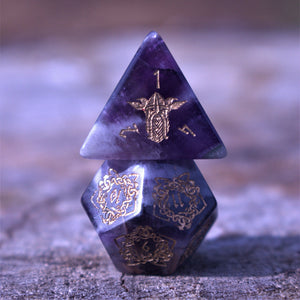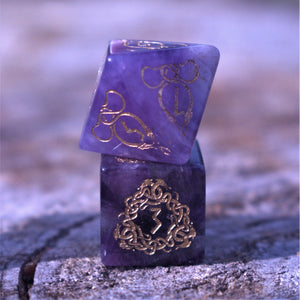 Each die is hand carved from pure gemstone and polished in a proper tumbler. Designs are then engraved into each side and hand painted. Gemstone dice are never guaranteed to have a perfectly balanced weight; however, each of our dice sets are always well weighted and well balanced.