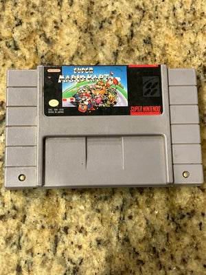 | Super Mario Kart can be played by one or two players. All gameplay uses a forced split screen view. In single player mode, the top displays the course, while the bottom screen can either display a rear-view mirror perspective, or an overhead view of the whole track, displaying where all the racers are currently. In multiplayer, the bottom screen is assigned to the second player's view. The first single player mode is Mariokart GP, in which one player races seven computer-controlled drivers or AI. Engine classes of 50cc, 100cc, and 150cc are available (150cc is available upon acquiring gold in all the cups in 100cc). Larger engines result in faster vehicles and a greater level of difficulty. There are four cups to select: the Mushroom, Flower, Star, and Special Cups (100cc and 150cc only). Each cup consists of five tracks and the player must receive fourth place or better in any track to advance to the next. Places five through eight are given the "ranked out" title. The second mode is Time Trial, in which the player races through one track in an attempt to set a record for best lap time or course time. Three multiplayer modes are also available: The first is Mariokart GP, which plays just like the single player version, but with one less computer-controlled driver. In order to proceed to the next track only one of the drivers is required to rank in the top four. The 2nd mode is Match Race, which is a one-on-one race on any track. The last mode, Battle Mode, is the only mode in which players do not race. Two players choose from four levels specially designed for battle mode and try to pop the three balloons surrounding the other player with items such as Koopa shells or banana peels. The last player with balloons wins. In Mariokart GP and Match Race modes racers can collect coins which affect top speed and acceleration. In all modes, Lakitu rescues drivers who have driven off the track for a price of two coins. In Battle Mode and Time Trials, there are no coins and thus no charge. |