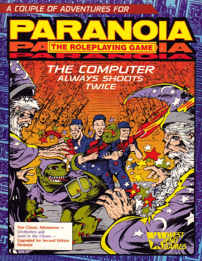 We got second edition Paranoia adventures. The Comptuer Always Shoots Twice contains two - count 'em, two - classic adventures, Orcbusters and Send in the Clones, substantially upgraded to conform to second edition Paranoia.