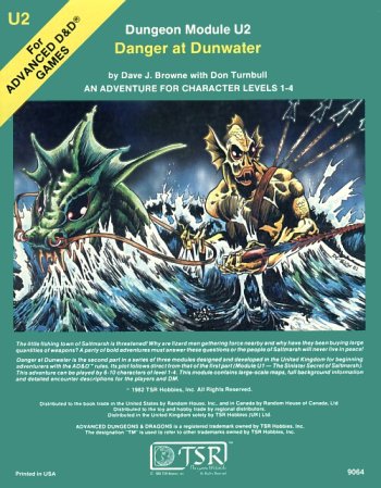 Danger at Dunwater is the second part in a series of three modules designed and developed in the United Kingdom for beginning adventurers with the AD&D rules. Its plot follows direct from that of the first part (Module U1 - The Sinister Secret of Saltmarsh). This adventure can be played by 6-10 characters of level 1-4. This module contains large-scale maps, full background information and detailed encounter descriptions for the players and DM.