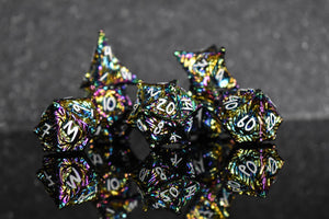 Our metal dice sets are all cast from zinc alloy metal to assure better balanced rolls. This set is perfect for any RPG and will be sure to impress at your upcoming session! Every set comes with its own metal dice tin for easy storage and a winning presentation.