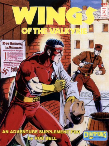 In the University Physics building, a man lies dying, murdered by an unseen assailant. Who stabbed him? And what secret lies hidden within the building's walls? It is up to you to ensure that justice is served and the dilemma resolved. Thus begins a roller-coaster investigation that will carry your heroes into a final confrontation with their unknown adversary. Along the way your heroes uncover a plot that could change the very course of history. Do you dare to stop the Operation Valkyrie? Wings Of The Valkyrie is a multi-part adventure scenario for Champions. It can stand alone or be integrated into an existing campaign. It includes a fully detailed mystery and tips on how to appropriately manage mystery scenarios. Wings also has an all-new supergroup, a large sourcebook giving background data, and guidelines on the sinister Bureau of Genetic Purity. So give your superheroes a challange more daunting than stopping the latest Viper plot. Give them the ultimate role playing quandry. Give them Wings of The Valkyrie!