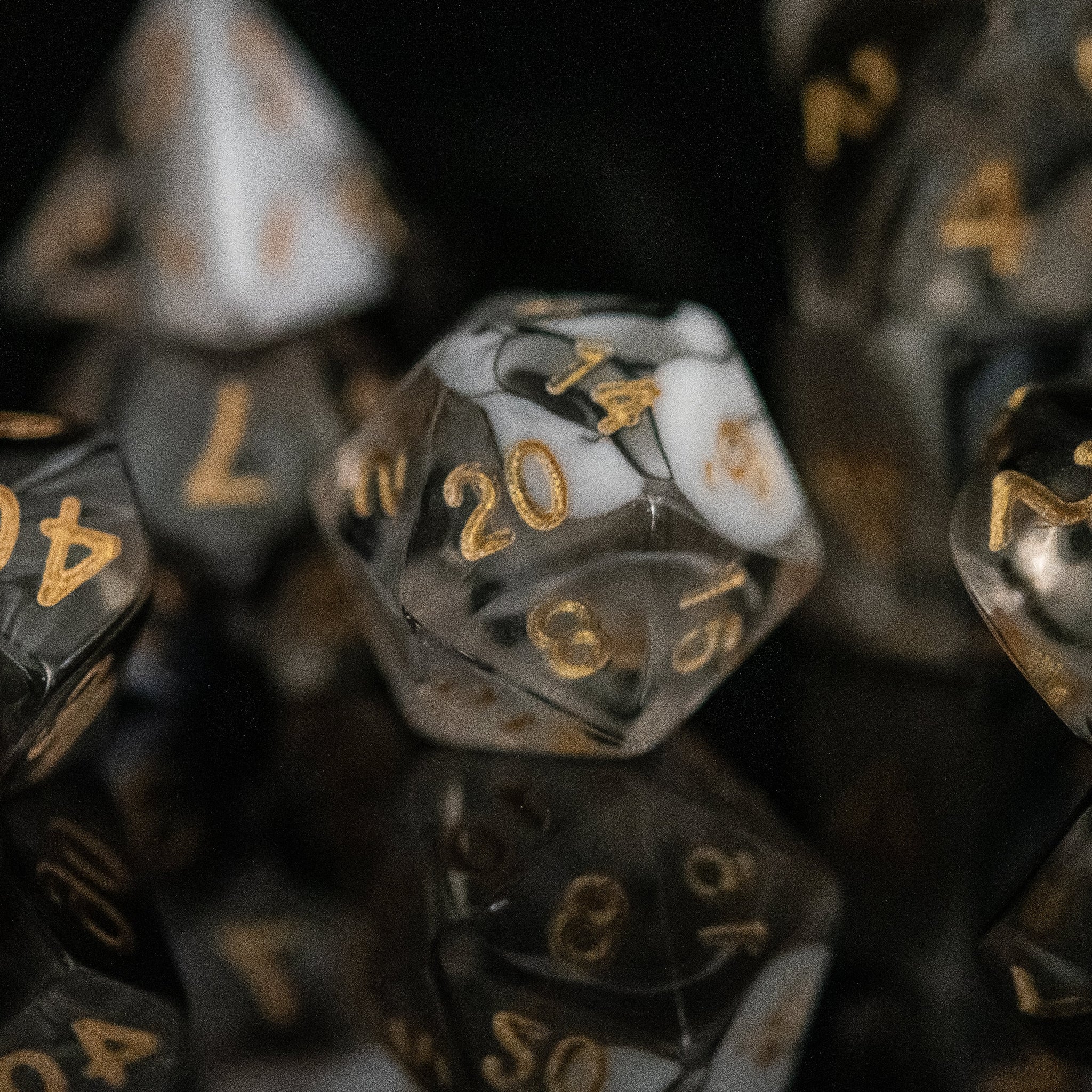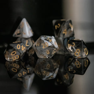Our acrylic dice are carefully poured into individual molds and cured inside a vacuum chamber to insure no air bubbles are trapped inside the dice. After curing, each individual die is removed from the mold and numbers are painted by hand. These dice are perfect for any RPG and will sure to impress at your upcoming session!